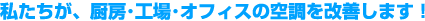 何となく気になっている換気の悪さ。 放っておくと、火事の原因になったり、衛生上問題になったりします。 ひとことに『換気が悪い』と言っても、その症状や原因は様々です。 例えば換気扇も、取り付け場所が悪いと本来の実力を十分に発揮できません。 あなたのお店やオフィスの空気循環を最適化することで、コスト削減にもつながります。 私たちは設計・製造・施工・メンテナンスまで、自社で行っていますから、 あなたの空間にピッタリの空気循環を迅速に、低価格でご提供できるのです。